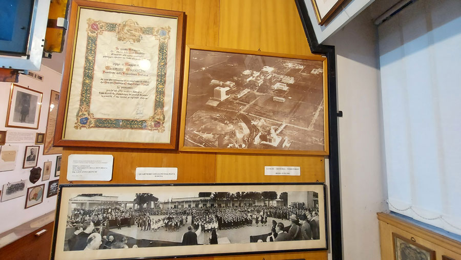 Nel ’45, sulla costa orientale dell’Adriatico, la Jugoslavia occupò l’Istria e la Dalmazia, veneziane da 1000 anni. I beni degli italiani furono confiscati e nazionalizzati e così iniziò il travaglio delle popolazioni Giuliano-Dalmata. Il 10 febbraio 1947 venne firmato il Trattato di Pace tra gli Alleati e l’Italia che sanciva ufficialmente la rinuncia dell’Italia in favore della Jugoslavia di 186 comuni, ovvero buona parte della Venezia Giulia, tutta l’Istria, l’intero Quarnaro e la Dalmazia veneziana. Lo stesso Trattato concedeva, ai cittadini italiani dei territori ceduti, il diritto di opzione sulla cittadinanza, ovvero per rimanere cittadini italiani (sebbene autoctoni da generazioni) dovevano lasciare la terra natia. Per tutti gli anni ’50 continuò l‘Esodo, e città come Pola, Rovigno, Pirano, Capodistria, Albona, Abbazia, Fiume, Cherso, Lussino, Dignano, Lagosta, Parenzo, Pisino, Zara, ecc. si svuotarono. L’Esodo riguardò complessivamente circa 350.000 cittadini italiani provenienti da cinque province adriatiche: Pola, Zara, Fiume, Trieste e Gorizia, ma lo spopolamento continuò fino alla prima metà dei ‘60, provocando l’abbandono di circa mezzo milione di persone. Molti di loro arrivarono a Roma e si stabilirono nei padiglioni del Villaggio Operaio E42.