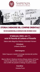 Il 9 febbraio abbiamo avuto il piacere di partecipare ad un incontro tenuto presso l’Aula III della facoltà di Lettere della Sapienza di Roma, dal titolo “Storie e memorie del confine orientale”.